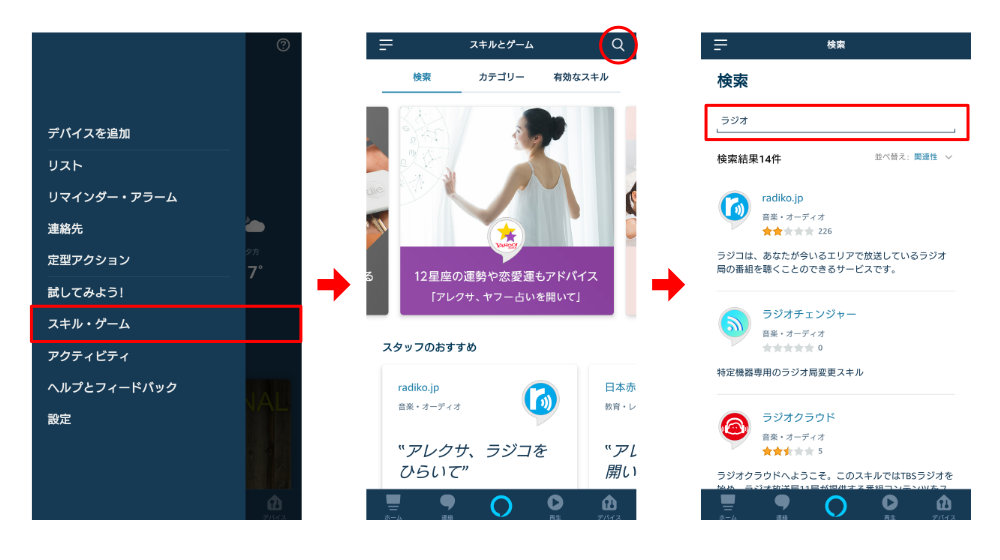 右上の検索ボタンを押し、「ラジオ」と入力してラジオスキルを検索します。