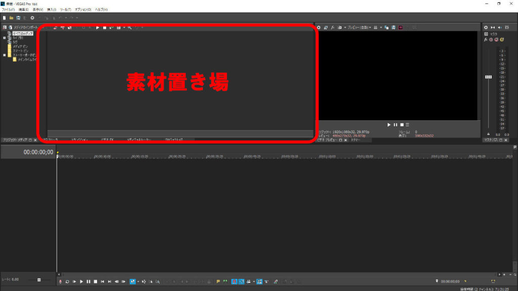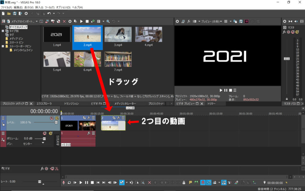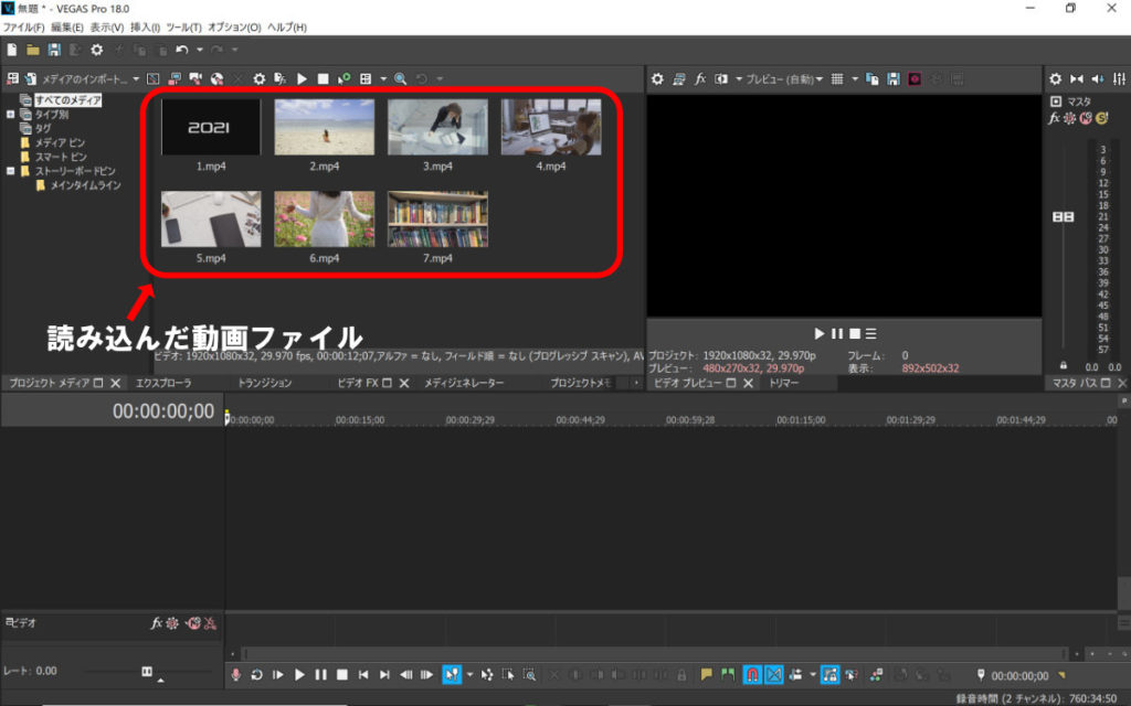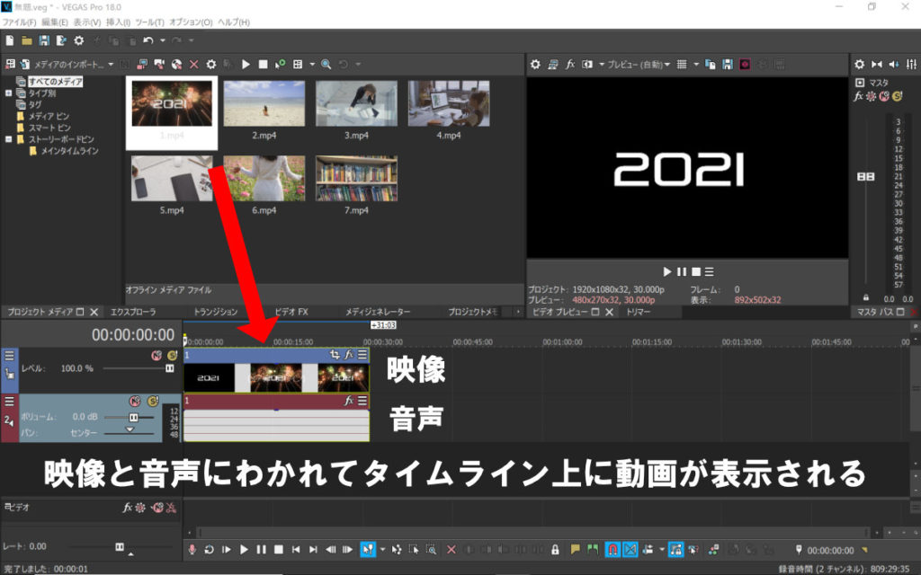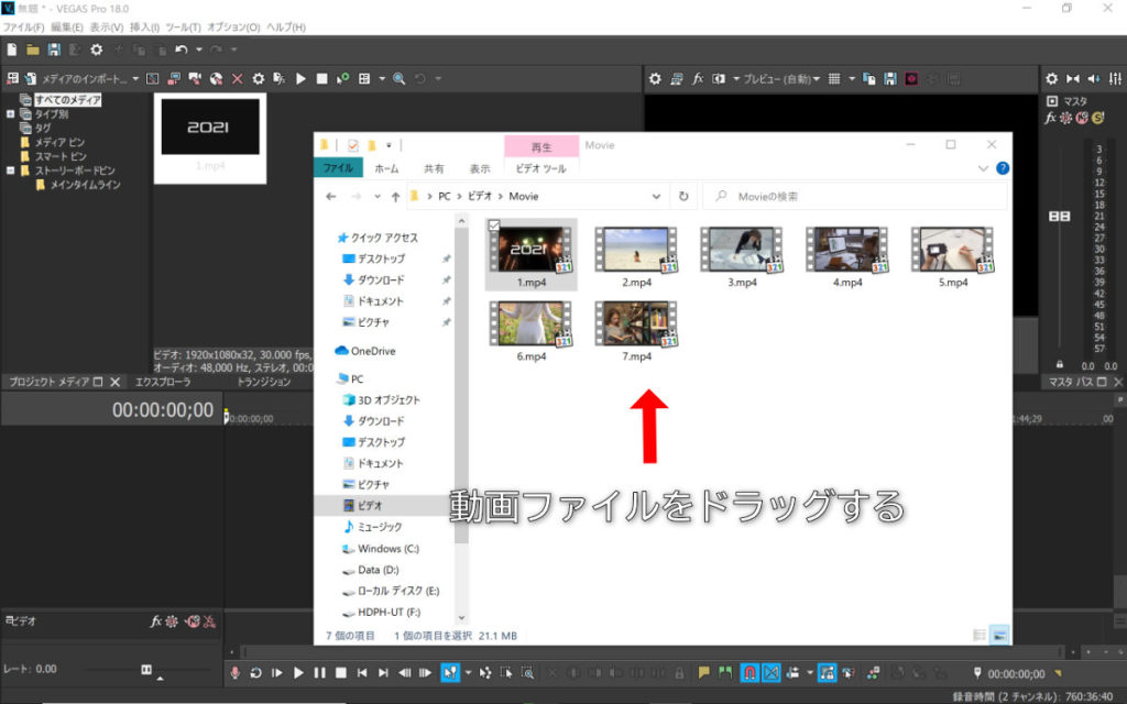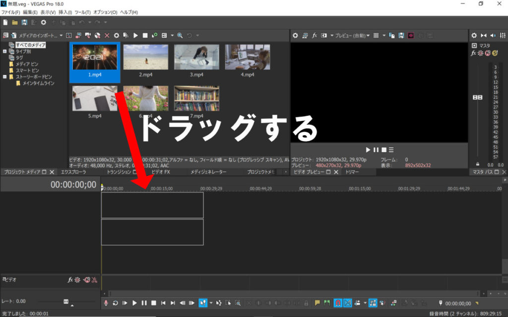 素材フォルダから動画ファイルをドラッグするとVEGAS PROに動画を読み込めます。