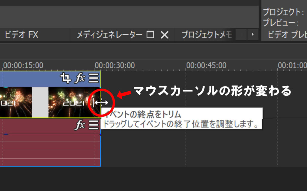 タイムライン上で動画の長さ、終点を調整するには、動画ファイルの右端(終点)をドラッグします。