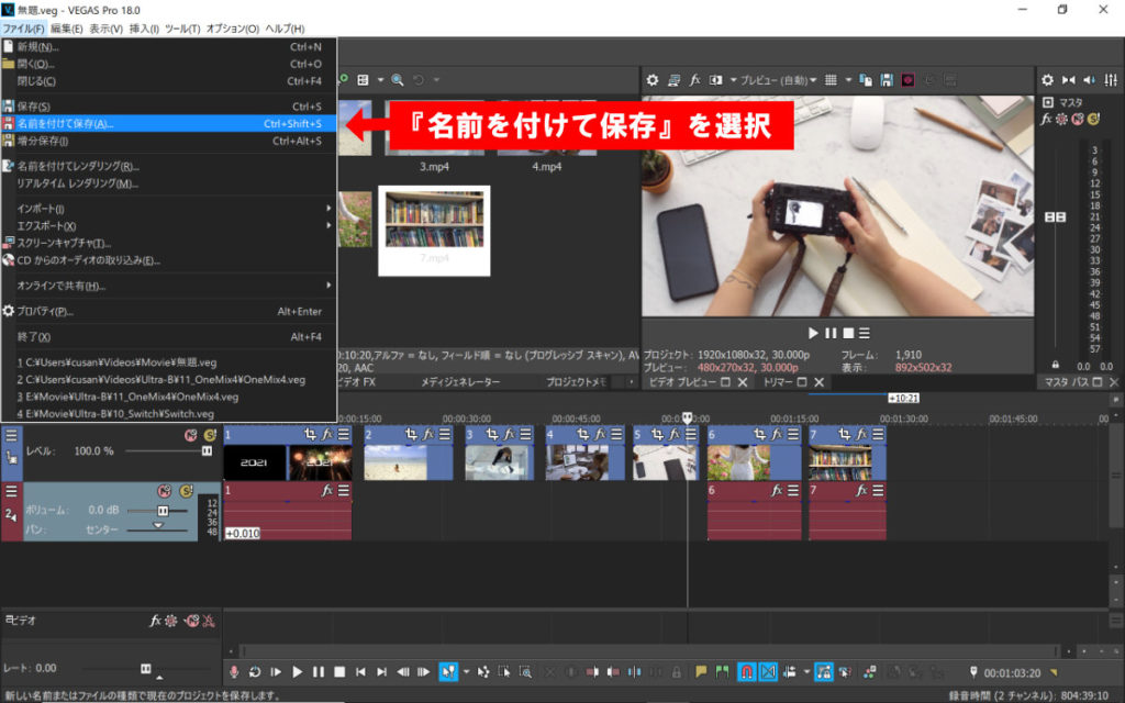 VEGAS Proを終了する前に念のため再度プロジェクトを上書き保存しておいてください。