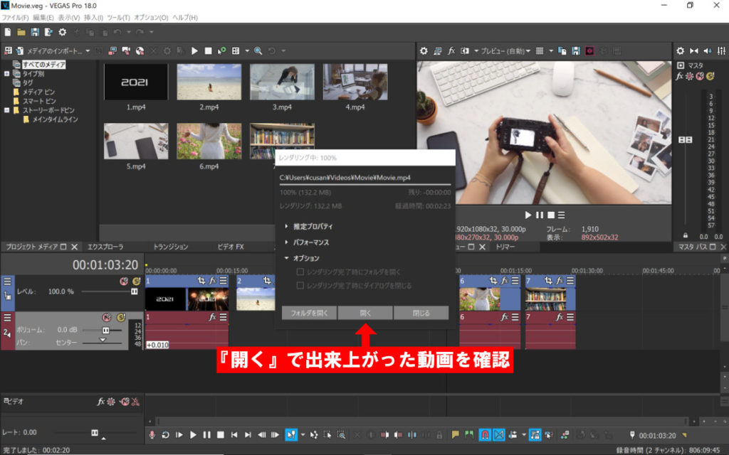 そのまま『開く』をクリックするか保存先のフォルダから出来上がった動画を確認してください。